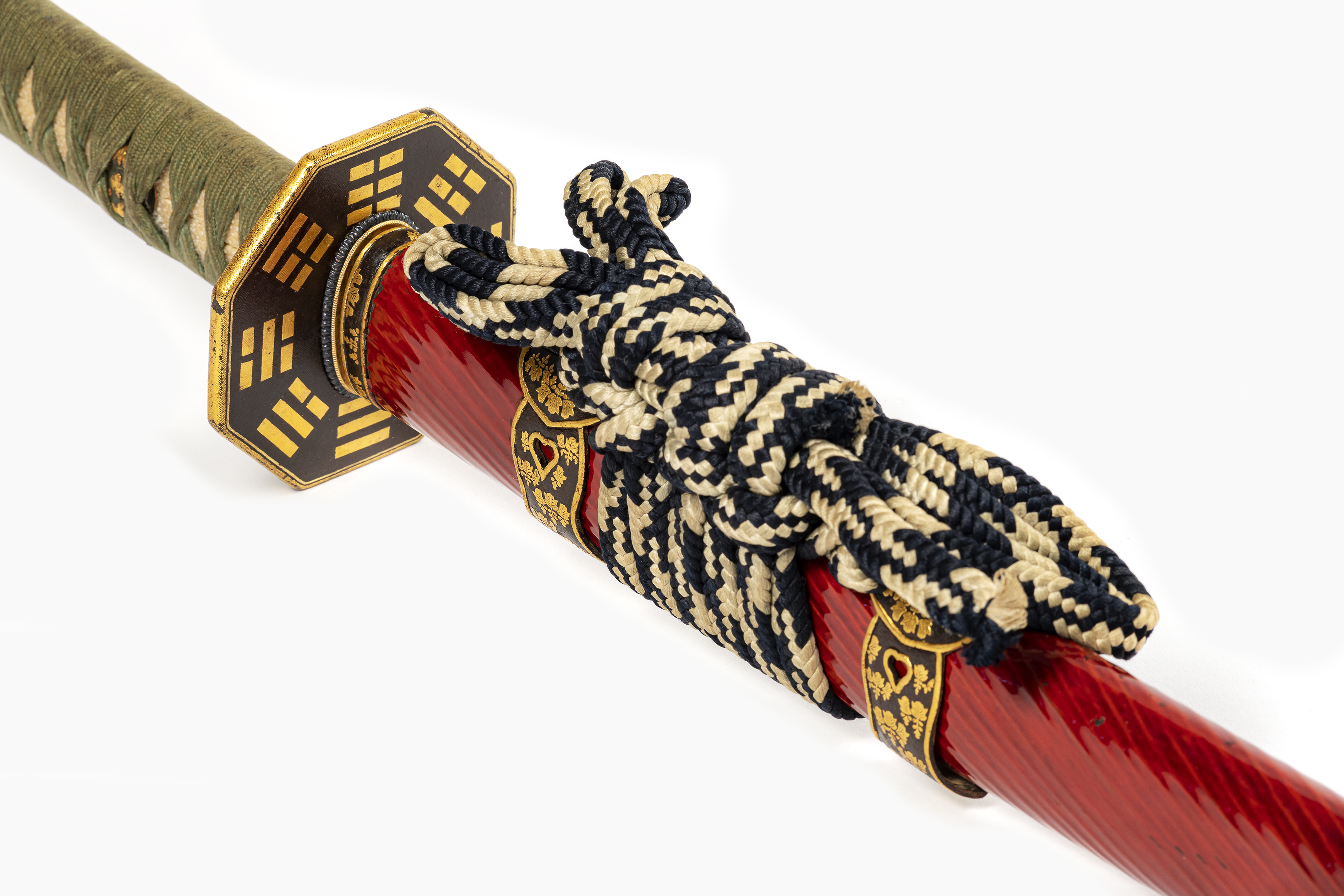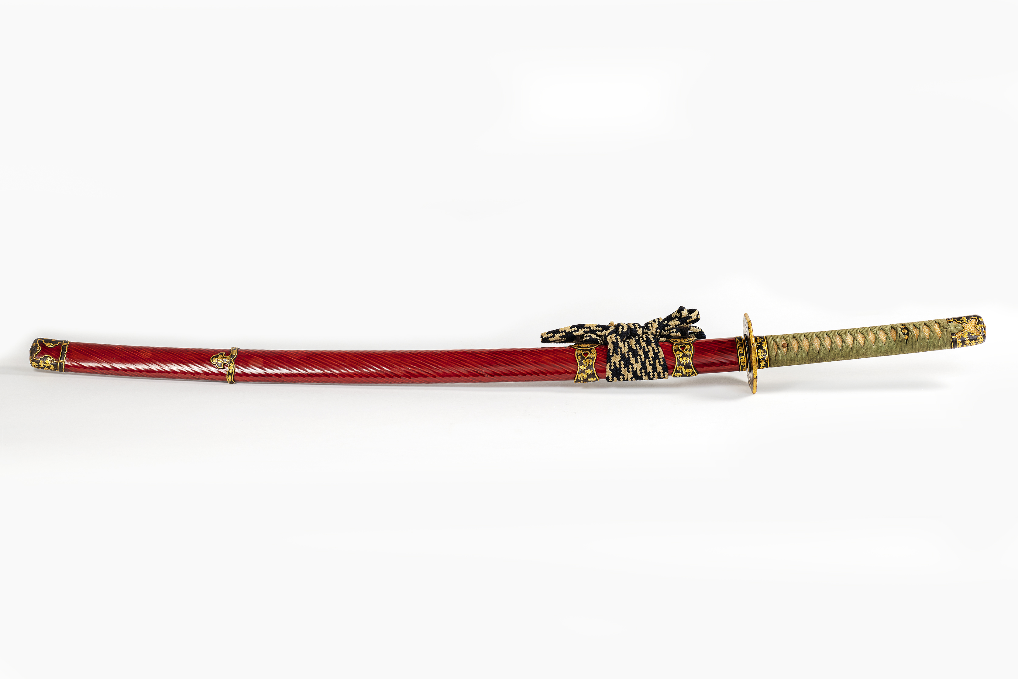 Spada giapponese (tōken) di tipo "tachi" dotata di montatura (koshirae) completa di impugnatura (tsuka) e fodero (saya). Quest’ultimo è in legno laccato di rosso (shu-nuri) e conserva la corda (sageo) composta di fili di seta intrecciati color panna e nero. Le parti decorative del fodero, ovvero kuchigane e kurigata nella parte superiore e shibabiki e ishizuki nella parte inferiore, sono tutti decorati con lo stesso motivo (mon) dorato su fondo nero: tre foglie di paulownia da cui partono altrettante inflorescenze che presentano, rispettivamente, tre, cinque e tre fiori (go-san no kiri). Lo stesso motivo è ripreso sull’anello (fuchi) che separa l’impugnatura (tsuka) dalla guardia (tsuba). L’impugnatura è costituita da due valve in legno ricoperte da un rivestimento di pelle di razza (samegawa); il tutto è avvolto da una fine nastratura (tsukamaki) con una fettuccia di seta verde (sageuchi). Gli elementi decorativi (menuki e kabutogane) del manico riprendono il motivo del “go-san no kiri”. La lama è inserita in un elemento metallico (habaki) che, collegato alla rondella (seppadai) per serrare i raccordi, mantiene ferma la lama all’interno del foro (nakago-ana) realizzato per inserirla nella guardia (tsuba). La guardia (tsuba), di forma ottagonale, presenta una decorazione con due grandi draghi dorati tra nuvole sulla parte esterna, mentre su quella interna sono visibili otto trigrammi (cin. bagua; giap. hakke), anch’essi dorati su fondo nero. La lama presenta una linea della tempra (hamon) di tipo ondulato largo (ō-notare) e la sua continuazione presente nella punta (bōshi) di tipo “komaru”
