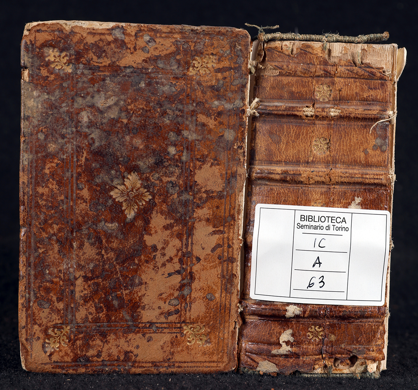 Legatura rigida in pelle su supporto in cartone, decorata ai piatti a secco con doppia cornice di triplo filetto. Le cornici sono raccordate esternamente agli angoli da fiorone in oro. Al centro dello specchio è presente un fiorone in oro. Dorso con quattro nervi doppi rilevati e sottolineati, decorati a secco con filetti trasversali e motivo a fiore in oro al centro delle caselle. Tagli dorati con titolo manoscritto sul taglio di piede