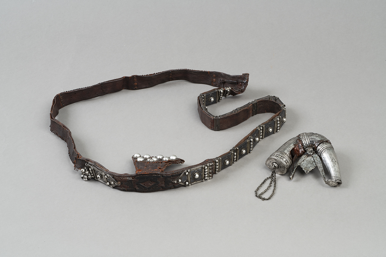 Polverino rivestito in lamina d’argento a sbalzo, inciso e cesellato con motivi geometrici e floreali. È fissato ad una coreggia da bulgaro, ovvero una cintura da indossarsi a tracolla da sinistra a destra, rivestita da placchette d’argento in forma di fascette di dimensioni alternate piccole-grandi e decorate con borchie