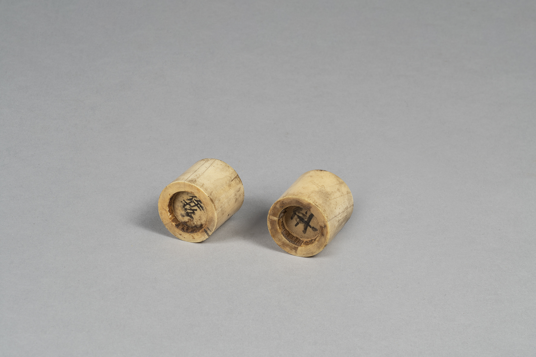 Coppia di elementi cilindrici in avorio, simili a sigilli, con ciascuno un'iscrizione a caratteri giapponesi