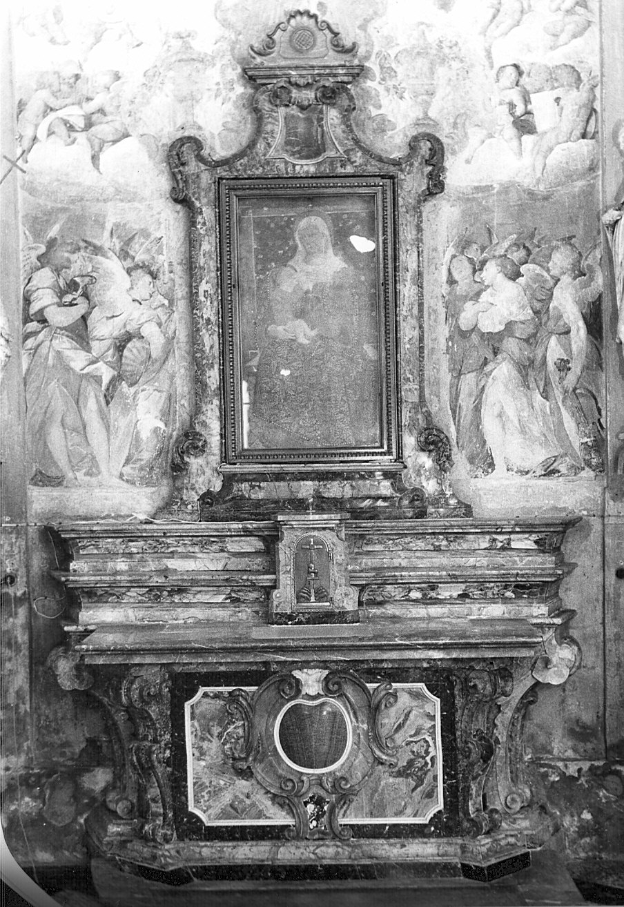 L'altare è costituito da vari marmi, prevalentemente grigio venato. Il paliotto, molto restaurato, è fiancheggiato da mensole con volute e intarsi di marmo rosato. Lateralmente altre mensole con foglie e volute in forte rilievo. Sopra i gradini della mensa, sporgenti lateralmente, si imposta la cornice in marmi grigio scuro con fastigio. In nicchie laterali sono poste due statue in gesso (scheda 0300001295)