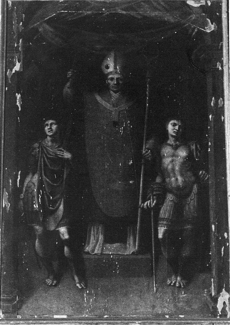 Personaggi: Sant'Ambrogio; San Gervasio; San Protaso. Attributi: (Sant'Ambrogio) staffile; mitra; pastorale; (San Gervasio) armatura romana; spada; palma del martirio; (San Protaso) armatura romana; spada; palma del martirio