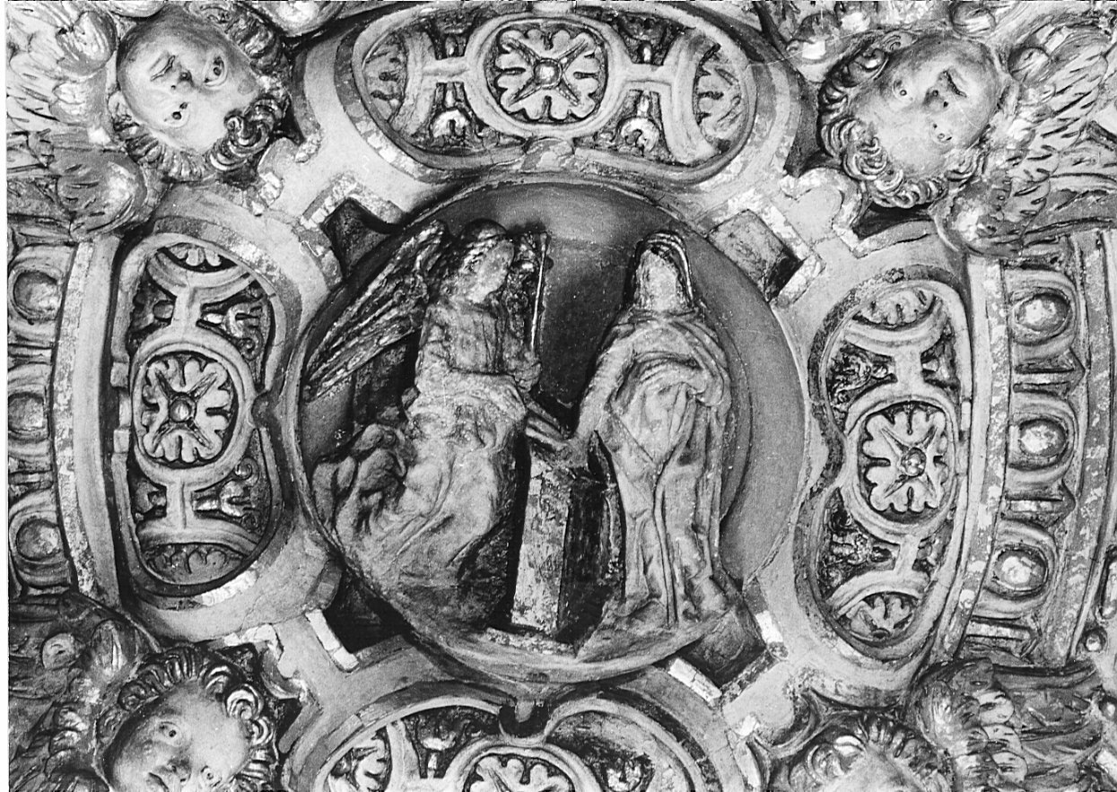 Volta a quattro vele sottolineate da costoloni a listelli variamente decorati in stucco dipinto che profilano anche la base delle vele. le membrature si inseriscono su erme con busto d'angelo e recano nella zona centrale cartelle a forma di cammeo con figure di angeli che per unirsi alla chiave di volta mediante teste alate di cherubini. Il sottarco presenta specchiature mistilineee con larga cornice alternate a cherubini