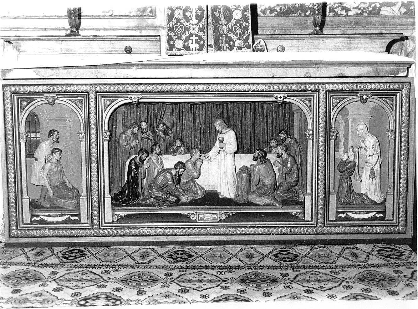 Paliotto d'altare intagliato raffigurante l'ultima cena con ai lati le congregazioni della Carità maschili e femminili