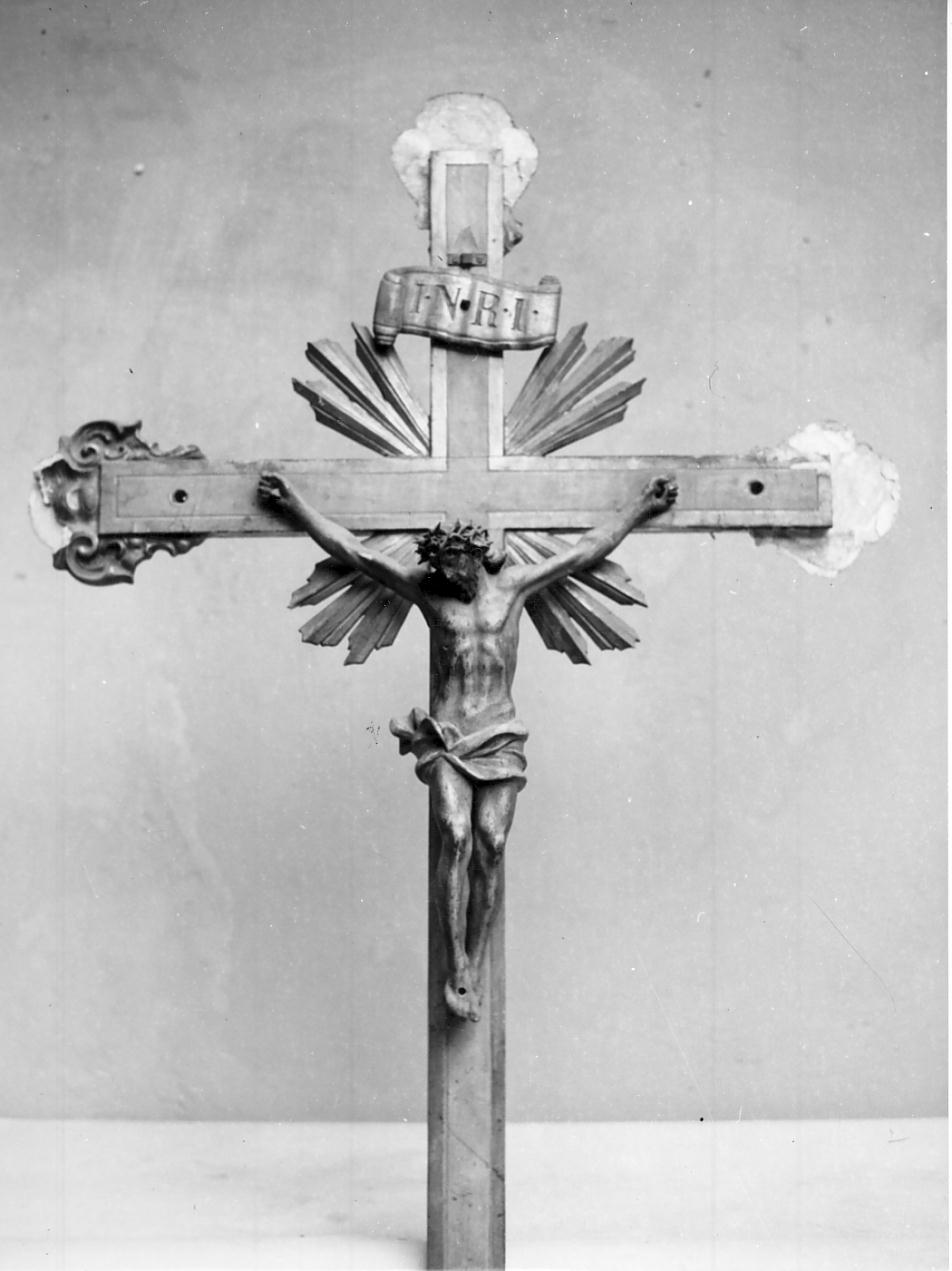 Croce con superficie laccata in azzurro chiaro e dorata ai bordi, con terminali (quasi interamente perduti) modellati in gesso con conchiglia e volute; figura del Cristo dipinta al naturale; raggera in legno dorato