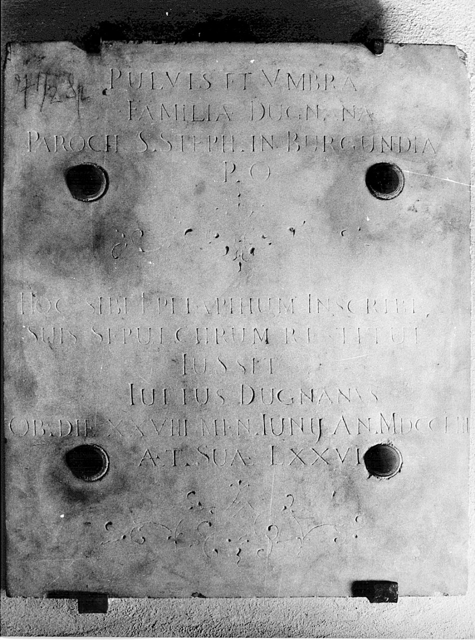 - NOTIZIE STORICO CRITICHE Probabilmente si tratta di lapide fune rari a pavimentale per l'erosione della superficie. Il Forcella (p.94) riporta l'iscrizione aprendo le abbreviazioni, ma non indicando l'ubicazione originaria. Il "Dizionario Storico Blasonico" (p .373) dice antichissima e nobilissima famiglia milanese ora estinta. A questa casa appartengono il Beato Clemente ed il Cardo Antonio. Un ramo ebbe il feudo a Terrazzano e si estinse in principio del XIX secolo. Un altro ramo ebbe il feudo di Cornaredo con titolo comitale. Il Mezzanotte (p.1005) dice che un ramo dei Dugnani abitava la contrada vicino alla scomparsa chiesa di S. Stefano di Borgogna in Via Cerva (ora Via Cino del Duca) fra Via (ora Corso) Monforte e Via Borgogna