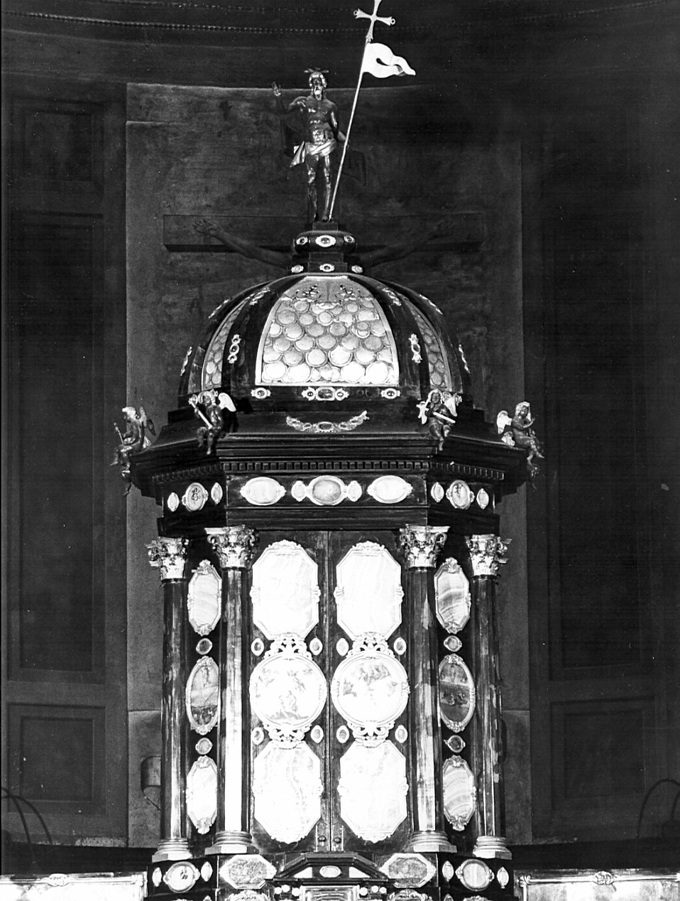 Tempietto di legno a base ottagonale irregolare, con due ali che s'incurvano a modo di absidi poligonali, rivestito di ebano a color di tartaruga. Parte anteriore: numerosi Medaglioni contenenti reliquie di Santi inquadrate in cornicette di bronzo dorato. Quattro eleganti colonnine di lastre d' argento rotonde e scannellate a capitelli corinzi sostengono la parte anteriore del tempietto. Parte posteriore: alle reliquie corrispondono altrettante lastre di onice africano dipinte, inquadrate in cornici bronzee e divise da colonnine marmoree. Qua e là sono incastonati pezzi di quarzo e di cristallo di rocca, alcuni incisi con i simboli della Passione. La copertura di questo è di madreperla a squame di pesce, sormontato da un Cristo Risorto di legno imitante il bronzo fuso, a tutto tondo, angeli e puttini, pure in legno portanti emblemi della Passione coronano tanto la cornice del tempietto come le colonnine delle due ali di fianco. Sulle ali due reliquari e due angeli di le gno a tutto tondo, con decorazioni dorate