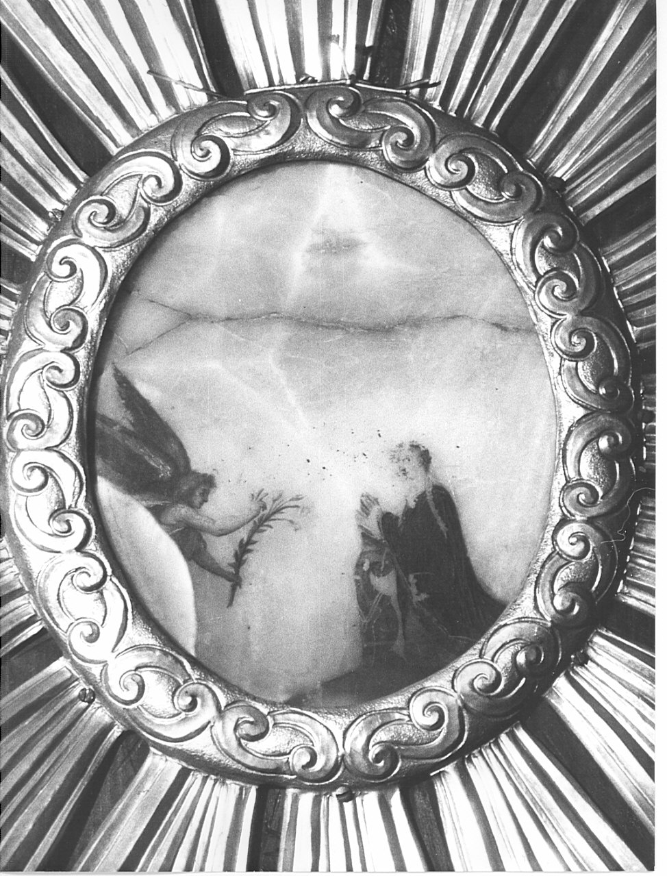 Tondo di lastra d'onice giallo chiaro su cui è dipinto la Vergine a destra, in vesti scure, posta in ginocchio in atto di preghiera e assorta, mentre riceve l'angelo dalle grandi ali il quale le porge un giglio. Cornice di bronzo dorato sbalzato a grande raggiera
