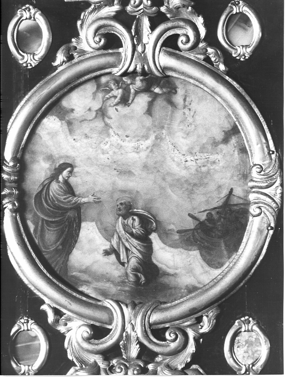 Lastra circolare d'onice giallo chiaro su cui è dipinto a destra la navicella con tre figure, tra le onde ricavate dalle venature più scure dell'onice. In primo piano il Redentore che tende la mano a Pietro, che lo segue sul mare. In alto due puttini. Cornice in rilievo di bronzo dorato con decorazione centrale