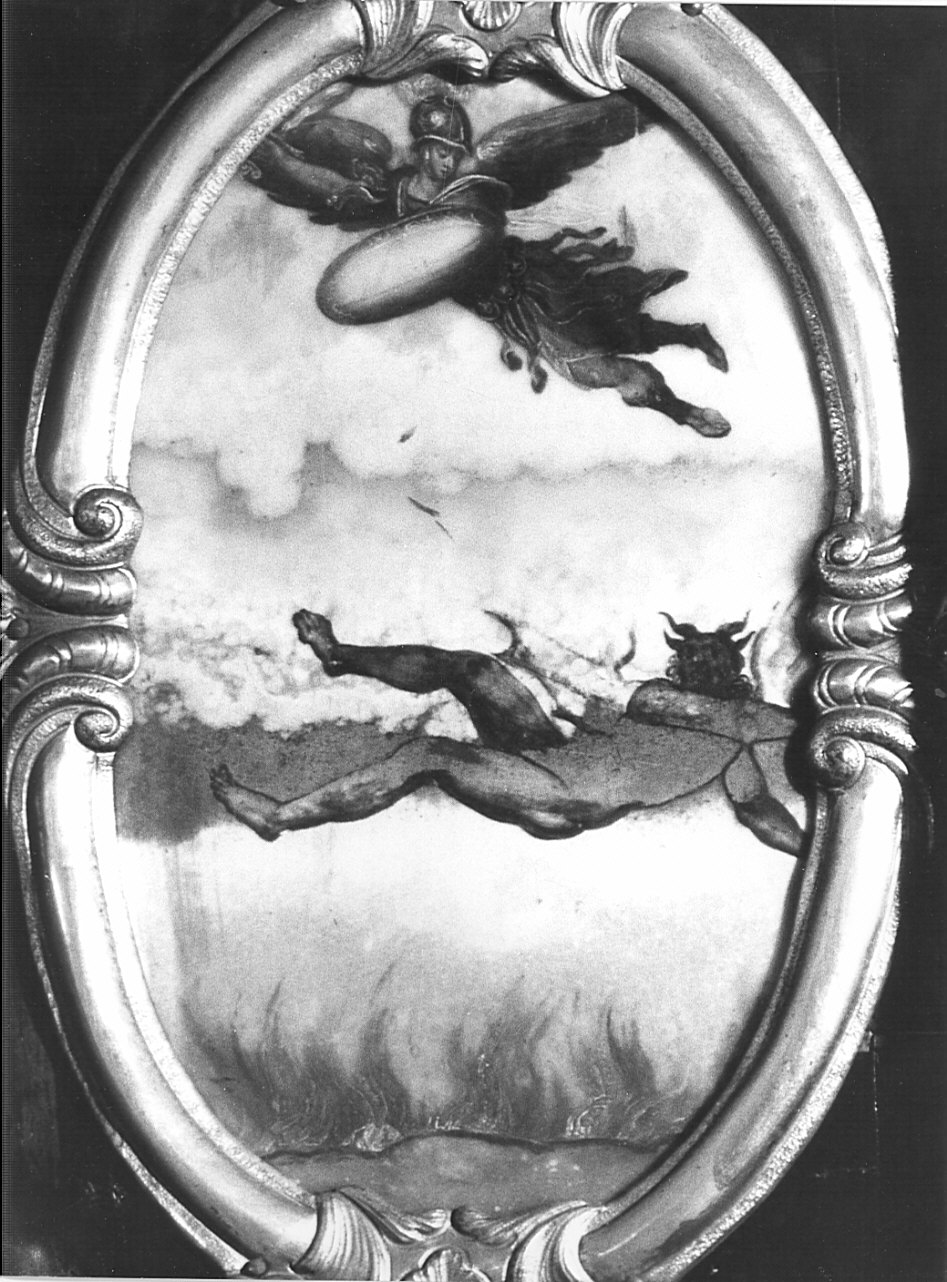Lastra ovale di onice chiaro su cui è dipinto in alto l'arcangelo in volo, mentre il demonio precipita fra le fiamme dell'inferno. Entro cornice decorata di bronzo dorato