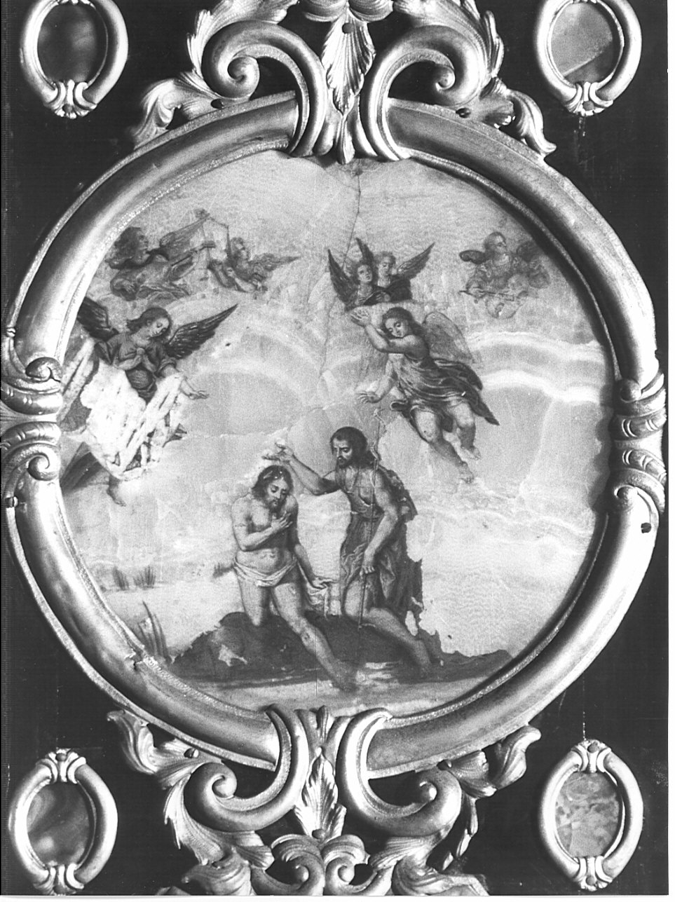 Lastra circolare di onice chiaro su cui è dipinto il Battesimo di Cristo su un isolotto. In alto volano due angeli reggendo un lenzuolo e uno strumento musicale. Altri angeli a mezzo busto, musicanti, sporgono dalle nuvole, ricavate dalle venature dell'onice. Cornice decorata di bronzo dorato