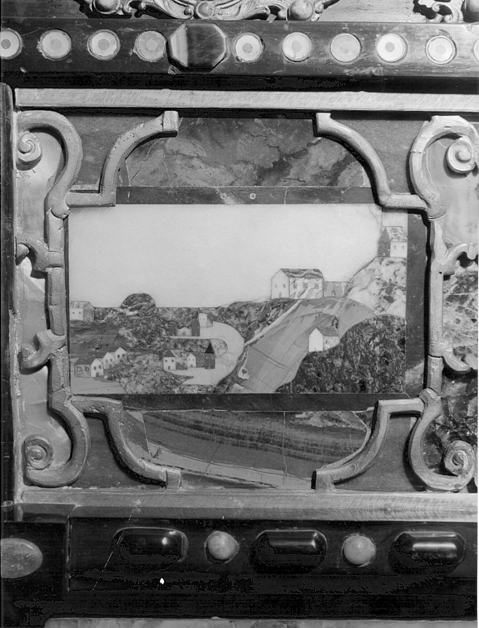 Formella rettangolare, a commesso, di pietre dure raffigurante un paesaggio su fondo di onice. A sinistra numerose casette di marmo bianco di Carrara con i tetti rossi su fondo di lapislazzulo, a destra colline di marmo verde antico e giallo di Siena. Limitato da cornice di marmo nero di Varenna. Formella ripresa da cornice mistilinea di bronzo fuso e dorato