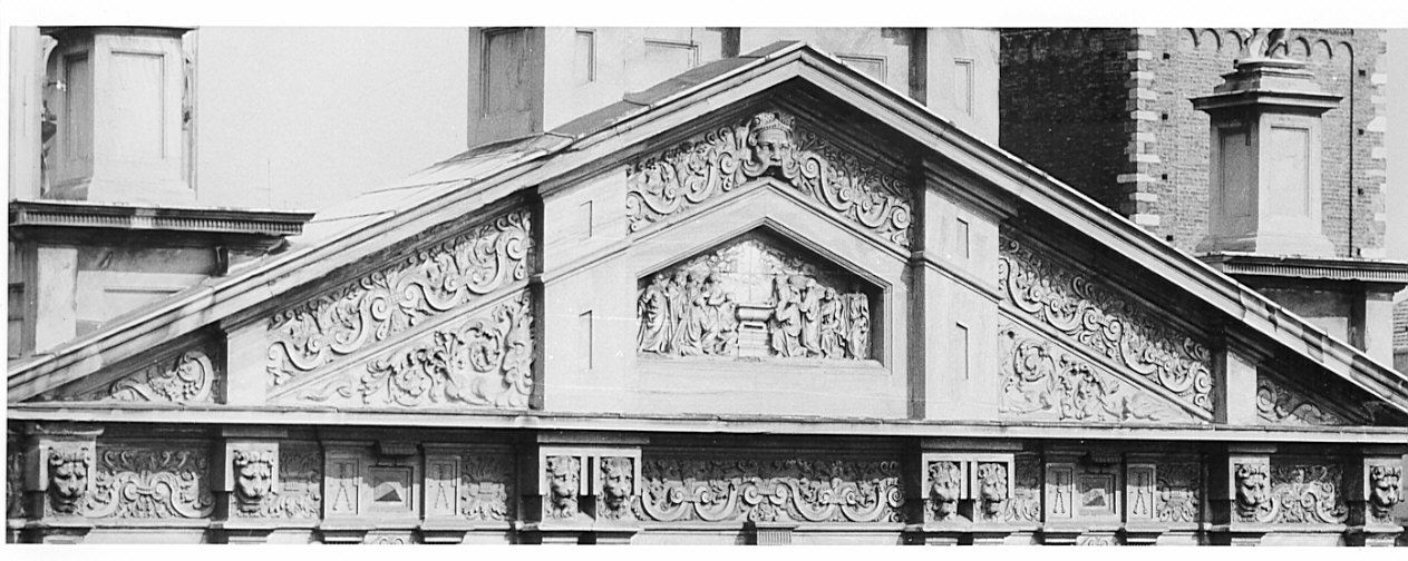 Fascia decorata con motivi a nastro e fiori, che corre lungo i rampanti del frontone e sotto alla cornice del frontone stesso. Qui si alterna con 8 grandi teste leonine e due cartelle decorate a punta di diamante. Al vertice del frontone un mascherone