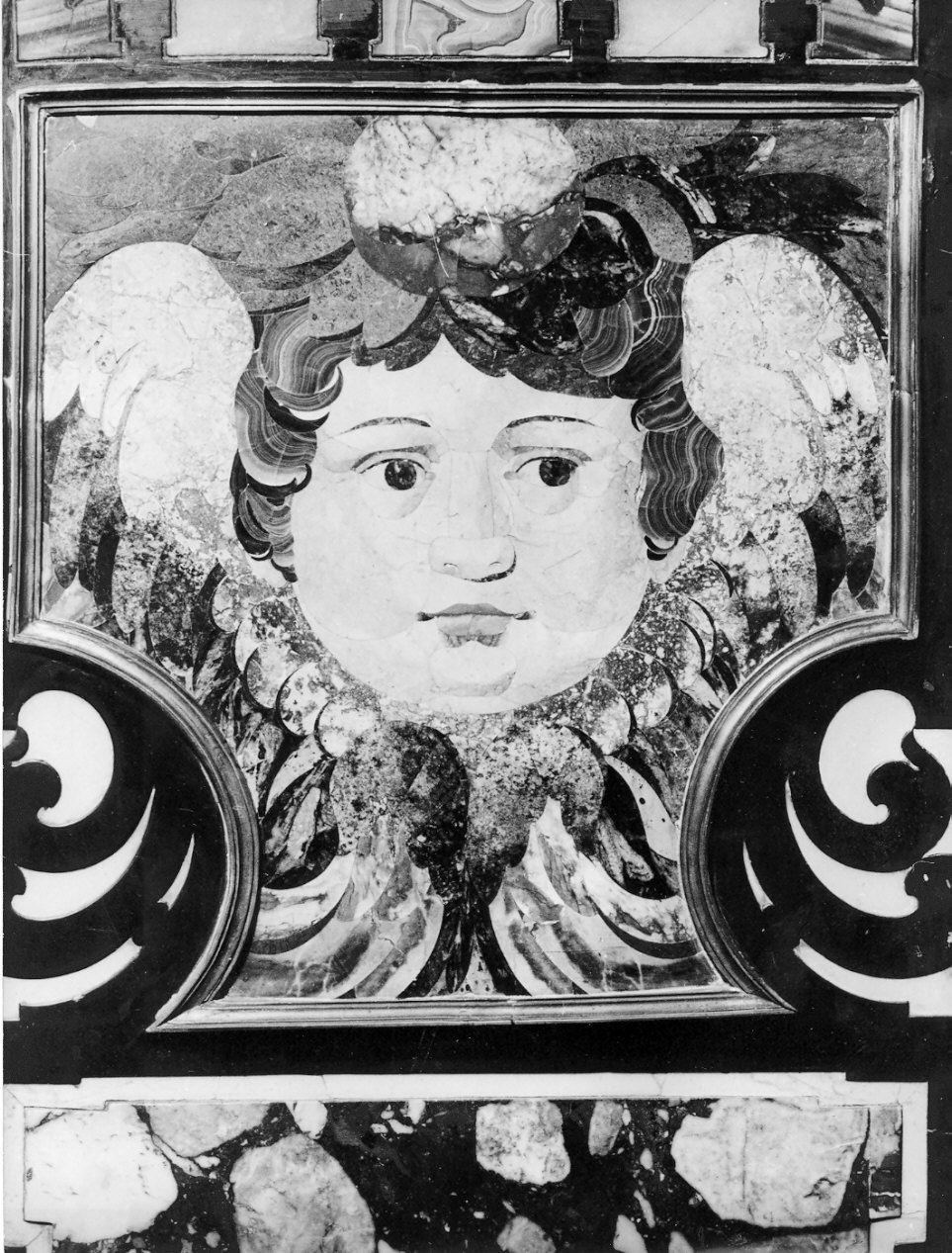 In onice venato le sfumature dei capelli con contrasti di verde Isorie ; pietrasanta chiara la faccia e scura le ciglia su cui spiccano vivi occhi in nero del BeIgio; le labbra e il mento in evanto scuro e chiaro. Attorno al capo le ali a cherubiho di pietrasanta pregiata tra giochi di macchiavecchia e lapislazzuli