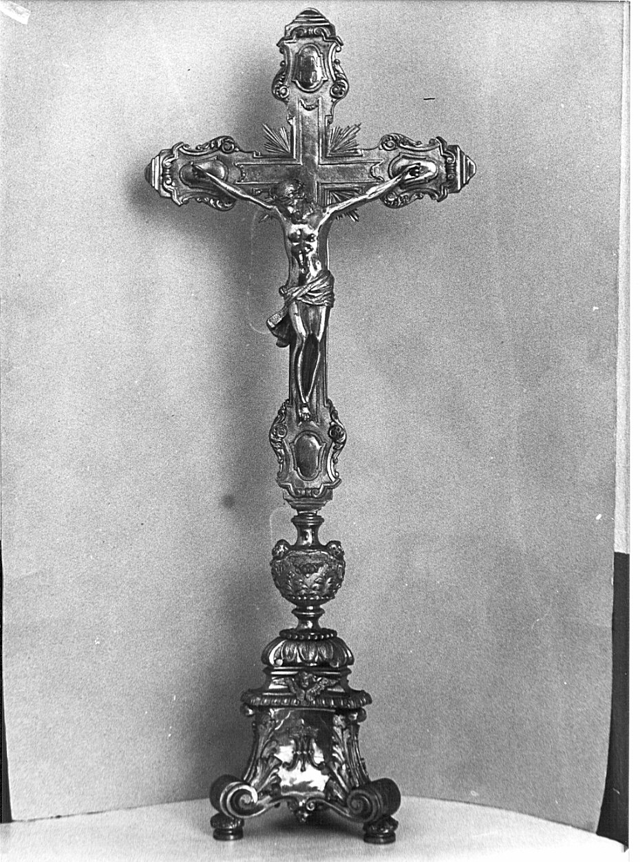 Croce d'altare in ottone fuso. Base triangolare a volute, motivi vegetali stilizzati, perlinatura, tre testine d'angelo e giro di palmette; monogramma mariano sul lato anteriore. Sopra il nodo panciuto con tre trstine d'angelo si imposta la croce con capicroce sagomati a cartriglio cieco. Crocifisso inchiodato a piedi sovrapposti
