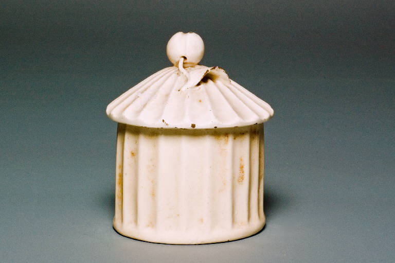 Coppia di barattoli in terraglia a smalto bianco e forma cilindrica con coperchio sormontato da un frutto