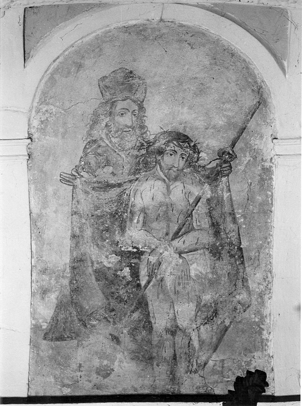 Ecce Homo. Cristo dilacerato, coperto da un manto rosso viene presentato alla folla da Pilato (?) dientro le sue spalle