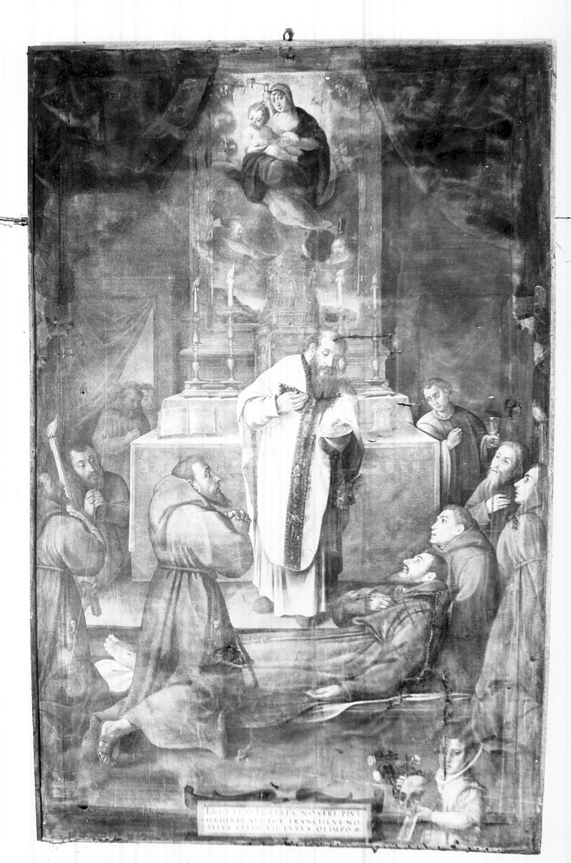 Ai piedi di un altare ornato di ricco tabernacolo e pala raffigurante Madonna col Bambino, San Francesco steso al suolo, circondato da confratelli che lo sostengono e pregano, riceve la comunione dal sacerdote officiante. Nell'angolo inferiore destro un bambino a mezzo busto con in mano un teschio, un mazzo di rose e un biglietto