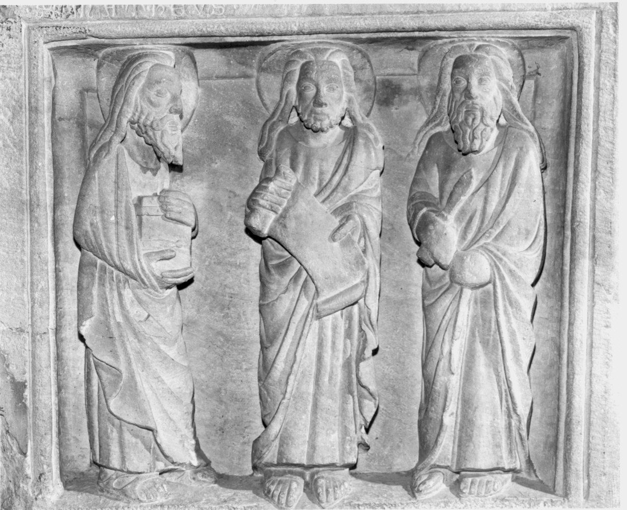 L'imponente vasca monolitica ottagonale ha sei lati ornati da figure (nei due rimanenti v'è solo una prima molto grossolana sbozzatura) in totale sono scolpiti a bassorilevo sedici figure (in quattro facce, tre figure cisacuna più due figure non finite; i tre Apostoli Tommaso, Simone e Filippo; al centro, raffigurato completamente di fronte, è Simone cui si rivolgono leggermente gli altri due con in mano libri o rotoli; Tre apostoli fra cui cui S. Matteo; gli altri due tengono in mano rispettivamente un rotolo e un pugnale. Stessa disposizione dei precedenti; Due Apostoli, rispettivamente con un libro e un rotolo, ciascuno entro una nicchietta. Entro due nicchiette chiuse da archetti trilobati, S. Pietro e un altro apostolo con spada e libro