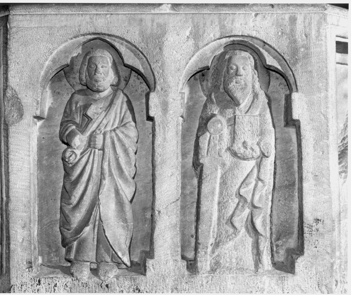 Entro due nicchiette chiuse da archetti trilobati, S. Pietro e un altro apostolo con spada e libro