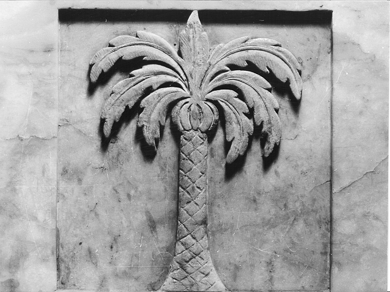 La formella decorata da una palma fa parte delle otto formelle sulla facciata della mensa d'altare. Il disegno è schematico, nitido e ha caratteri di essenzialità comuni anche alle altre decorazioni che rappresentano i simboli mariani