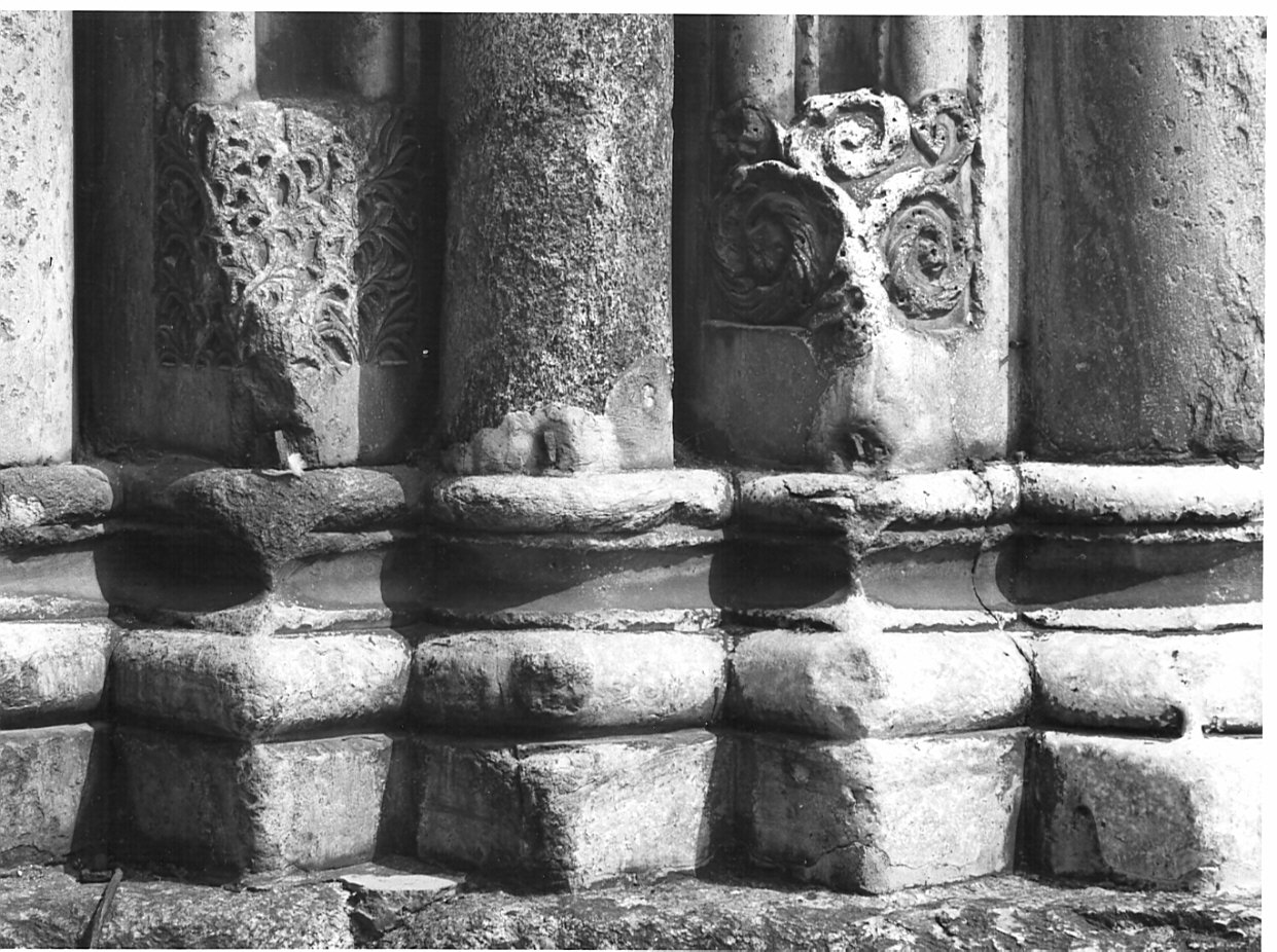 Alto zoccolo disposto a risega su cui poggiano quattro colonne e altrettanti cantucci; questi ultimi presentano, poco sopra al piedistallo, a partire da destra, un motivo a girali e uno a rilievo alquanto deteriorato, in cui però è ancora chiaramente leggibile la trama di motivi decorativi vegetali