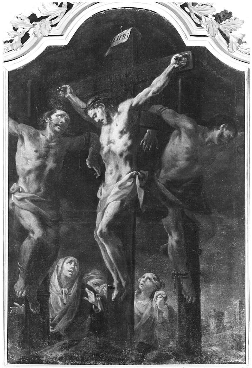 La scena è dominata dai tre crocifissi: grigio il corpo di Gesù al centro, bruni rossicci i due ladroni, quello di destra con perizzoma azzurro scuro. Ai piedi delle croci sono, a mezzo busto, la Vergine in veste azzurre e rosate, e due donne, una di esse con veste azzurrina. Sullo sfondo a destra è un castello. La tela è collocata entro cornice in legno