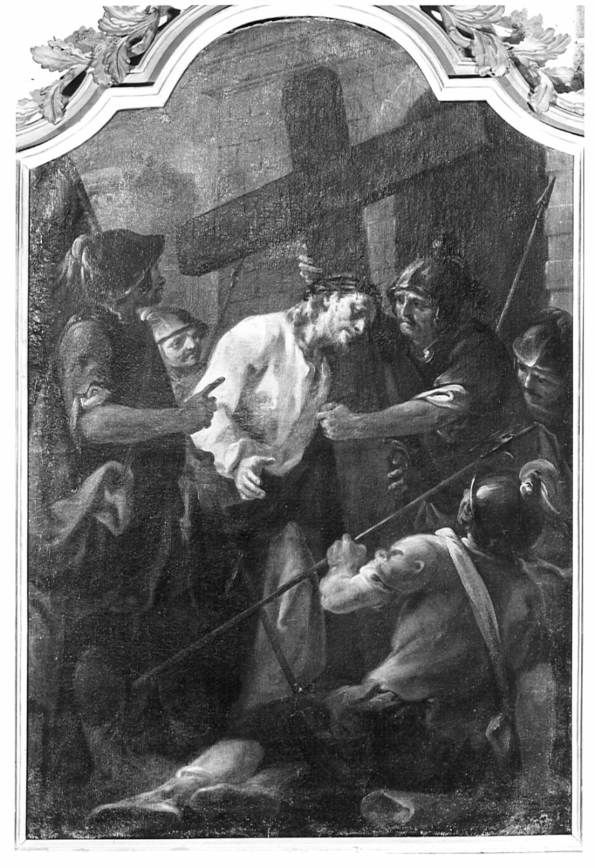 Su uno sfondo con edifici, Gesù è al centro con veste rosata e mantello azzurro ai fianchi, in piedi a capo chino. Un soldato gli porge la croce, un altro a sinistra ha un mantello rosso vivo ai fianchi e un terzo seduto a terra a destra porta un corpetto bruno con fascia rossa e pantaloni azzurri. In secondo piano sono altri soldati armati di lance. La tela è posta entro cornice in legno
