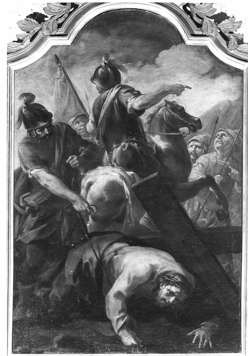 Gesù caduto a terra sotto la croce è raffigurato in veste rosata e mantello azzurro ai fianchi, mentre un soldato con mantello rosso lo tiene legato a una fune. Al centro un cavallo e un cavaliere in azzurro pallido; più arretrati sono altri soldati con una bandiera bianchiccia. Sullo sfondo il cielo grigio rotto da una luce giallognla. Le tinte in secondo piano sono toni grigi. La tela è posta entro cornice in legno