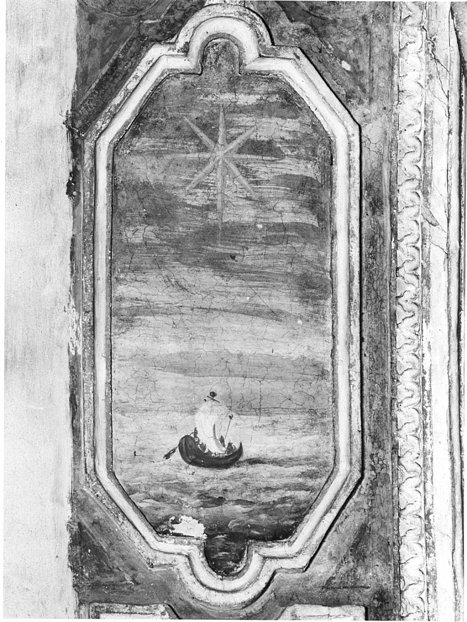 Nell'intradosso, quattro incorniciature sagomate in stucco bianco e oro, sono sei medaglie con emblemi mariani, da sinistra a destra: la stella del mare