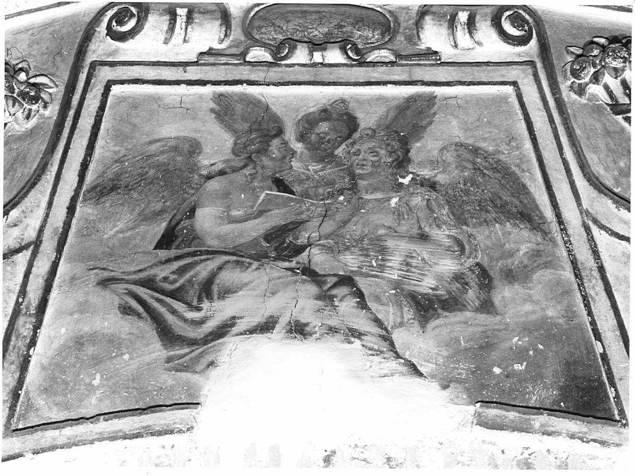Sull'estradosso, verso l'interno della cappella, entro incorniciature a stucco bianco e oro con motivi ornamentali e figurati (Angeli con cornucopie) figurano al centro tre Angeli musicanti, vestiti di verde, rosso e azzurro