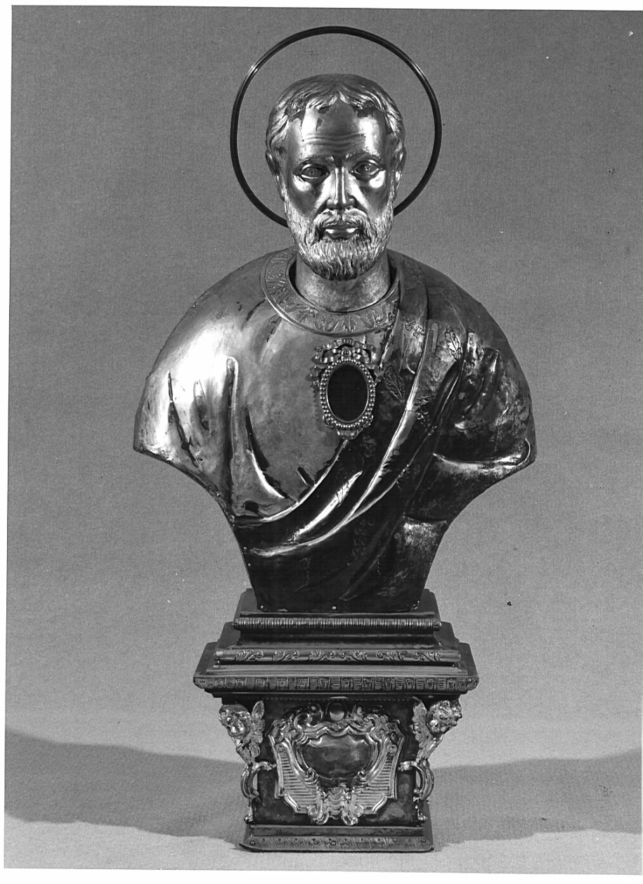 Da una base ornata da testine alate e un ovale entro cartoccio s'alza il busto del santo coperto da una veste, con colletto a fascia decorato da motivi fogliacei e da una sopraveste avvolgente la spalla sinistra, con foglie e rametti incisi. La testa è incorniciata da una corta chioma mossa e dalla barba. Al centro del busto è la teca ovale, chiusa da vetro, ornata da un nastrino intrecciato