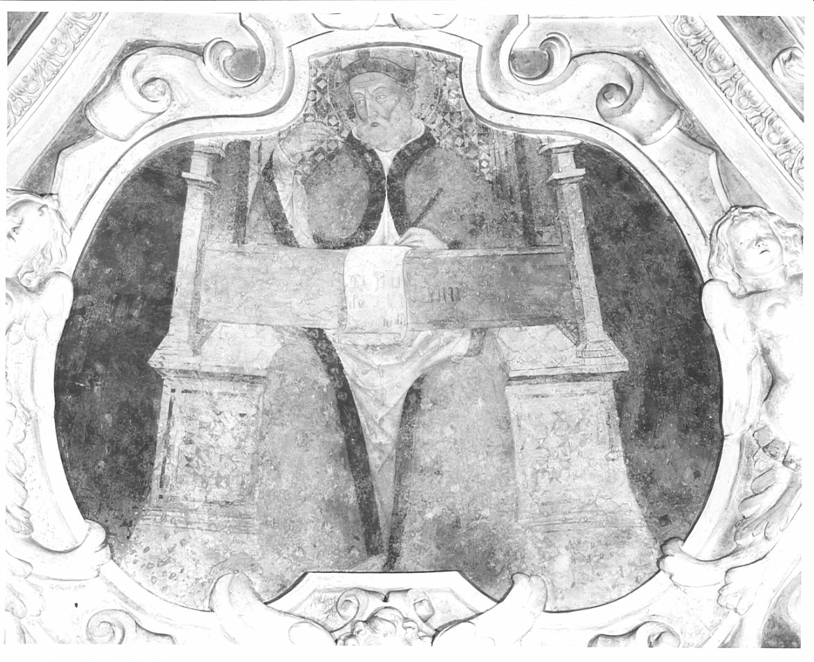 Figure: Dottore della Chiesa. Mobilia: scrittoio; sedile. Oggetti: penna; cartiglio