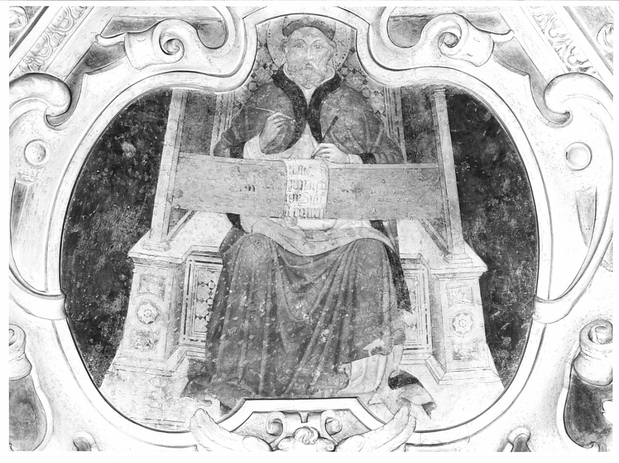 Figure: Dottore della Chiesa. Mobilia: scrittoio; sedile. Oggetti: penna; cartiglio