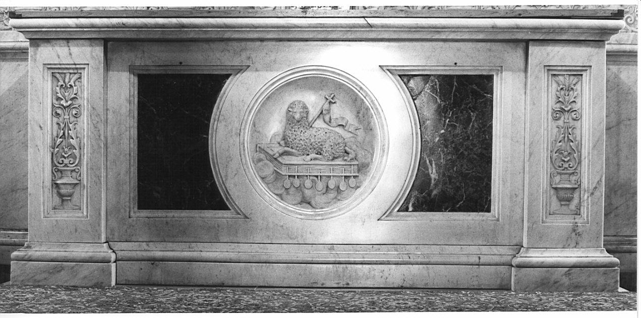 Ai lati due specchiature decorate con bassorilievi: anfore con baccellatura sul rigonfiamento reggono motivi floreali e spighe di grano. Al centro, in una calotta (diametro 50.5, profondità 5.5) il bassorilievo raffigurante il simbolico agnello sul libro a sette sigilli. Ai lati della circonferenza in marmo bianco, specchiature in marmo verde alpi