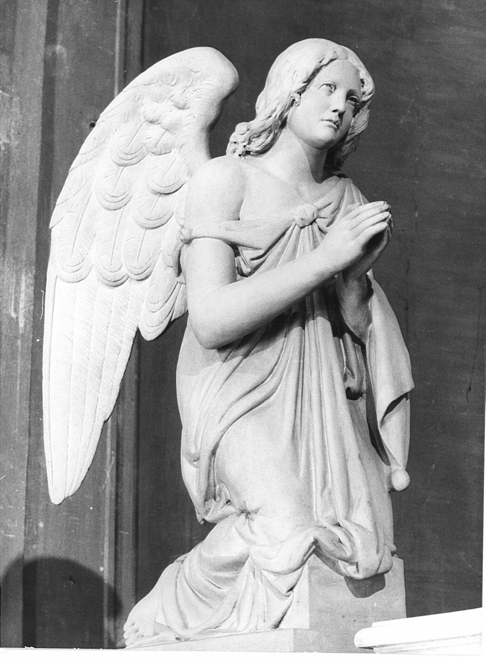 L'angelo è rivolto verso il centro dell'altare. Piedi scalzi, mani giunte, vesti allacciate sul petto, capelli fluenti sulle spalle. Il basamento fa corpo unico con la scultura