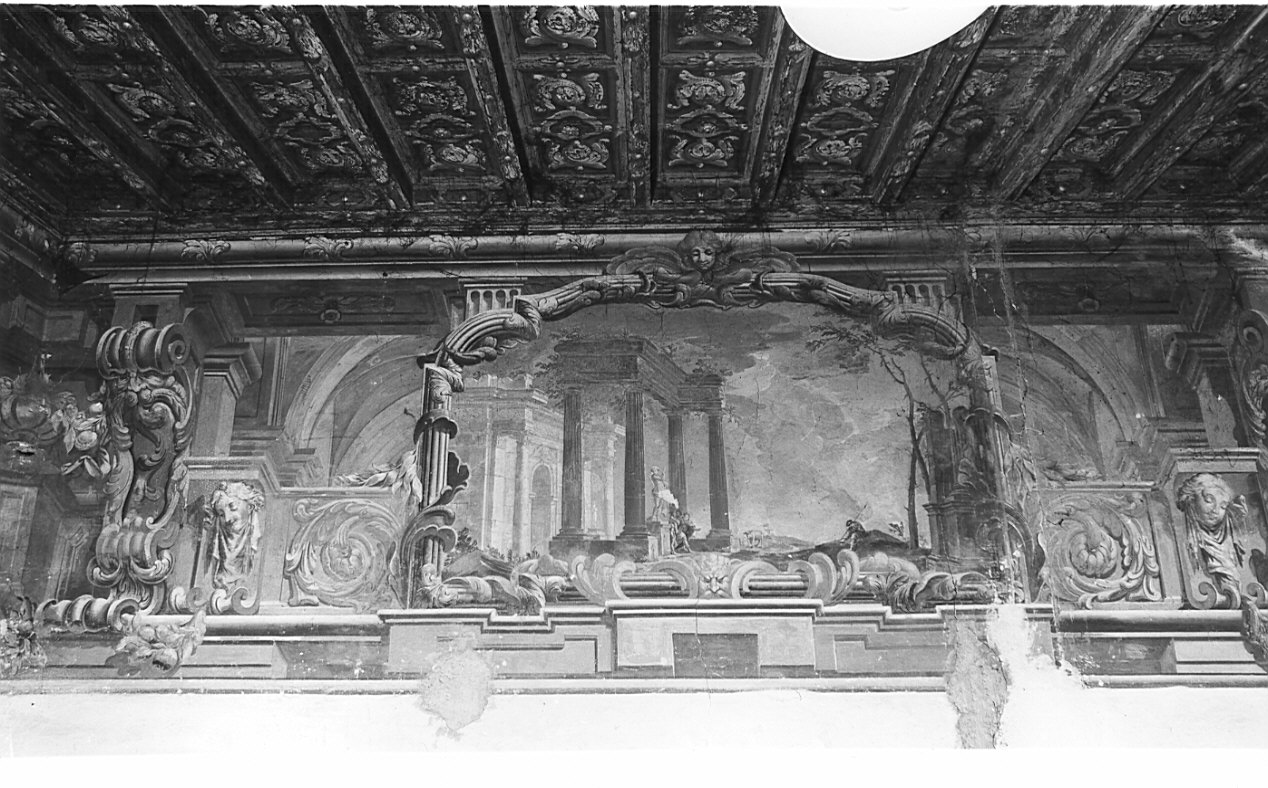 - NOTIZIE STORICO CRITICHE I due affreschi appartengono almeno per quanto riguarda gli elementi architettonico-decorativi alla mano della stesso pittore che ha eseguito i dipinti delle altre due pareti della stanza (cfr. scheda 45). E' probabile però che un secondo artista sia intervenuto a dipingere i due paesaggi che sembrerebbero posteriori per l'eleganza già settecentesca. Si potrebbe forse pensare ai pittori Ripamonti e Venino che secondo S.Langè (Ville della provincia di Milano, Milano 1972, p.106) avrebbero lavorato nella villa nel 1740 ca. Mentre il nome del Venino è del tutto ignoto, un Ripamonti pittore di quadrature della metà del secolo è citato in Thieme-Becker Kunstlerlexikon