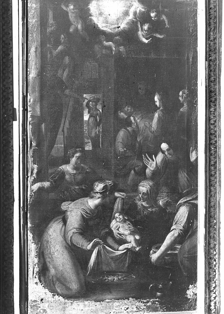 Personaggi: Madonna; Sant'Anna; San Gioacchino. Figure femminili: donne. Figure: angeli. Mobilia: letto. Oggetti: bacile