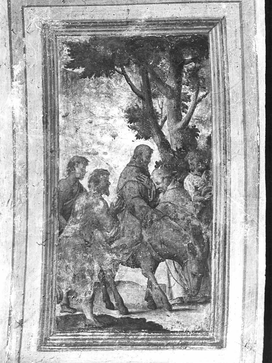 Figure maschili: frati francescani; uomini; mendicante. Piante: albero. Animali: asino