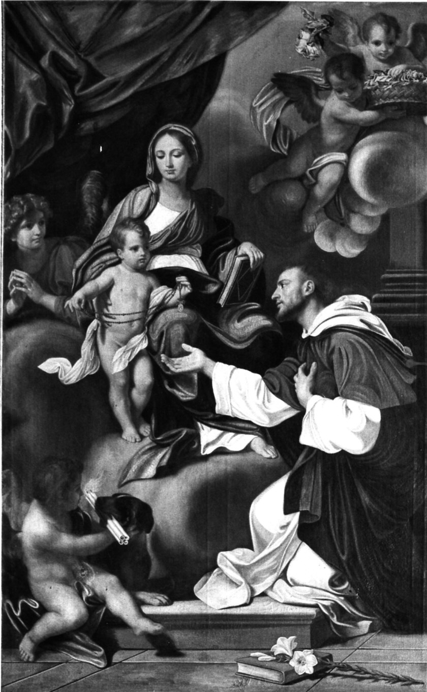 Personaggi: Madonna; Gesù Bambino; S. Domenico. Figure: angeli. Oggetti: rosario
