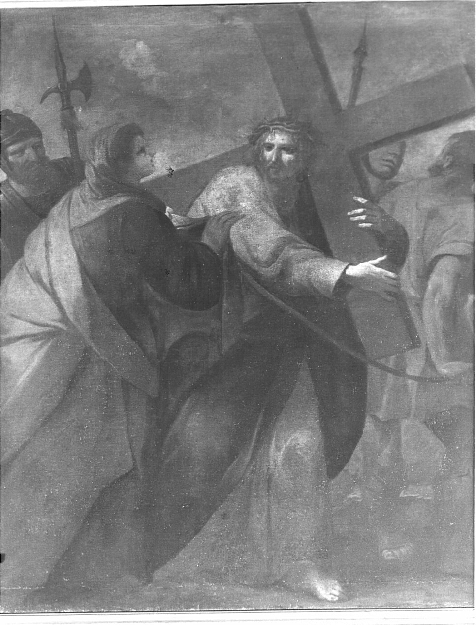 Personaggi: Cristo; Veronica. Figure maschili: soldati; carnefice. Armi: lancia; alabarda. Oggetti: croce; sudario; corona di spine