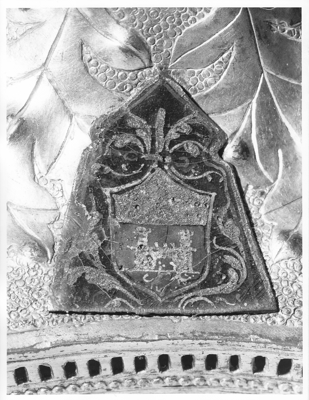 - STEMMI sulla base dell'ostensorio - gentilizio - Emblema - stemma con un castello a due torri in smalto azzurro e marrone, lamine in argento e oro
