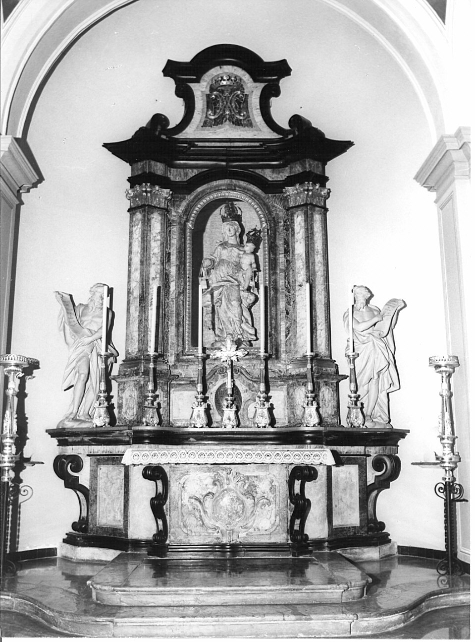 Base ad andamento mistilineo fiancheggiata da grandi volute in marmo nero e decorata da specchiature in marmo grigio. L'ancona ha pilastri laterali sghembi in marmo grigio poggianti su plinti sghembi. Capitelli in legno dorato sormontati da cornice fortemente aggettante agli angoli in marmo nero. Al di sopra fastigio con voIute laterali e cimasa mistilnea nero Al centro il simbolo mariano sormontato da una corona. Al centro dell'ancona nicchia centinata con la statua della Madonna del Carmelo (cfr scheda n. 03/ 00065036). Ai lati due statue di profeti moderne. Paliotto scheda n. 03/ 00065036-1