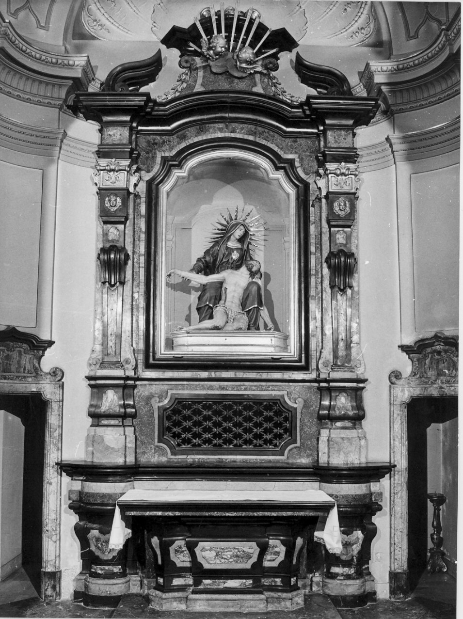 Altare di linea imponente, ha paliotto in marmo nero con specchiature in giallo e grigio come la base. Il dossale che s'imposta su un'alta fascia in marmo grigio con nicchia al centro protetta da una grata in ferro battuto, è limitato lateralmente da lesene in marmo nero rastremate e sormontate da capitelli in legno dorato. Cornice nera e cimasa con volute e fastigio centrale in marmo decorato da teste di cherubini in legno dorato. Al centro del dossale nicchie con doppia cornice mistilinea in marmo nero e legno dorato racchiudente il gruppo della Pietà