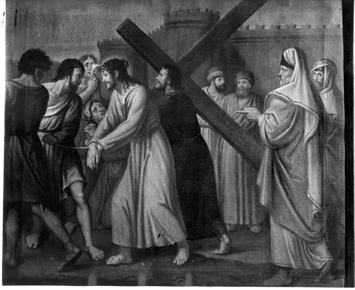 Personaggi: Cristo. Figure: figure maschili; figure femminili. Oggetti: croce. Architetture: mura