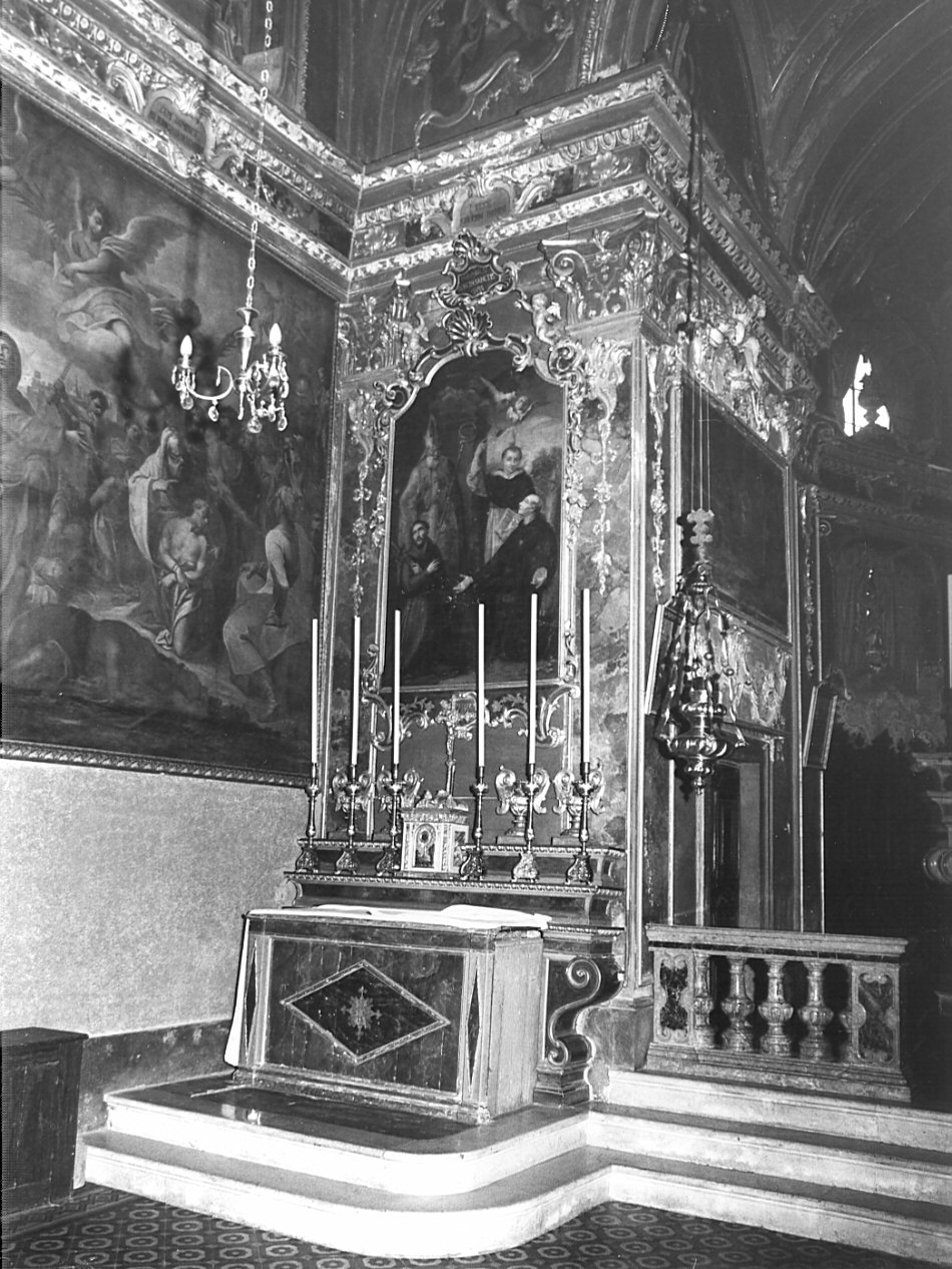 - NOTIZIE STORICO CRITICHE L'altare, che il suo pendant in quello situato sul lato destro della navata, appare gravemente falsato e illeggibile nella struttura originaria, alla quale appartengono probabilmente il paliotto, il tabernacolo e, ridipinto, il dossale. Gusto decorativo del paliotto e andamento delle anse laterali del dossale confermano la collocazione al XVIII secolo