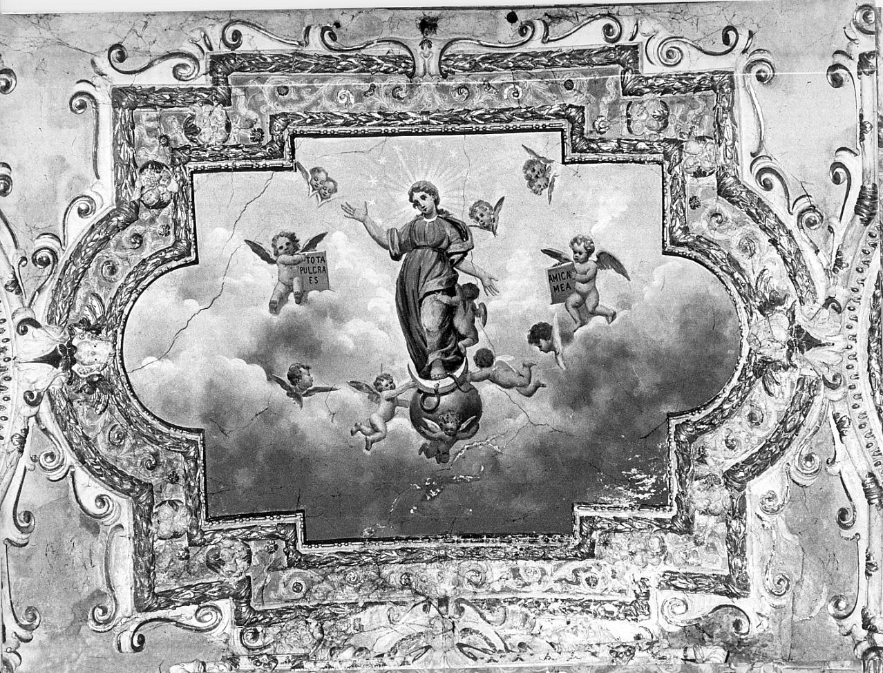 La decorazione a stucco è a motivi ornamentali barocchi con teste di angelo, festoni, motivi a cartella; cornici assai evidenziate all'interno delle quali sono raffigurati tre dipinti