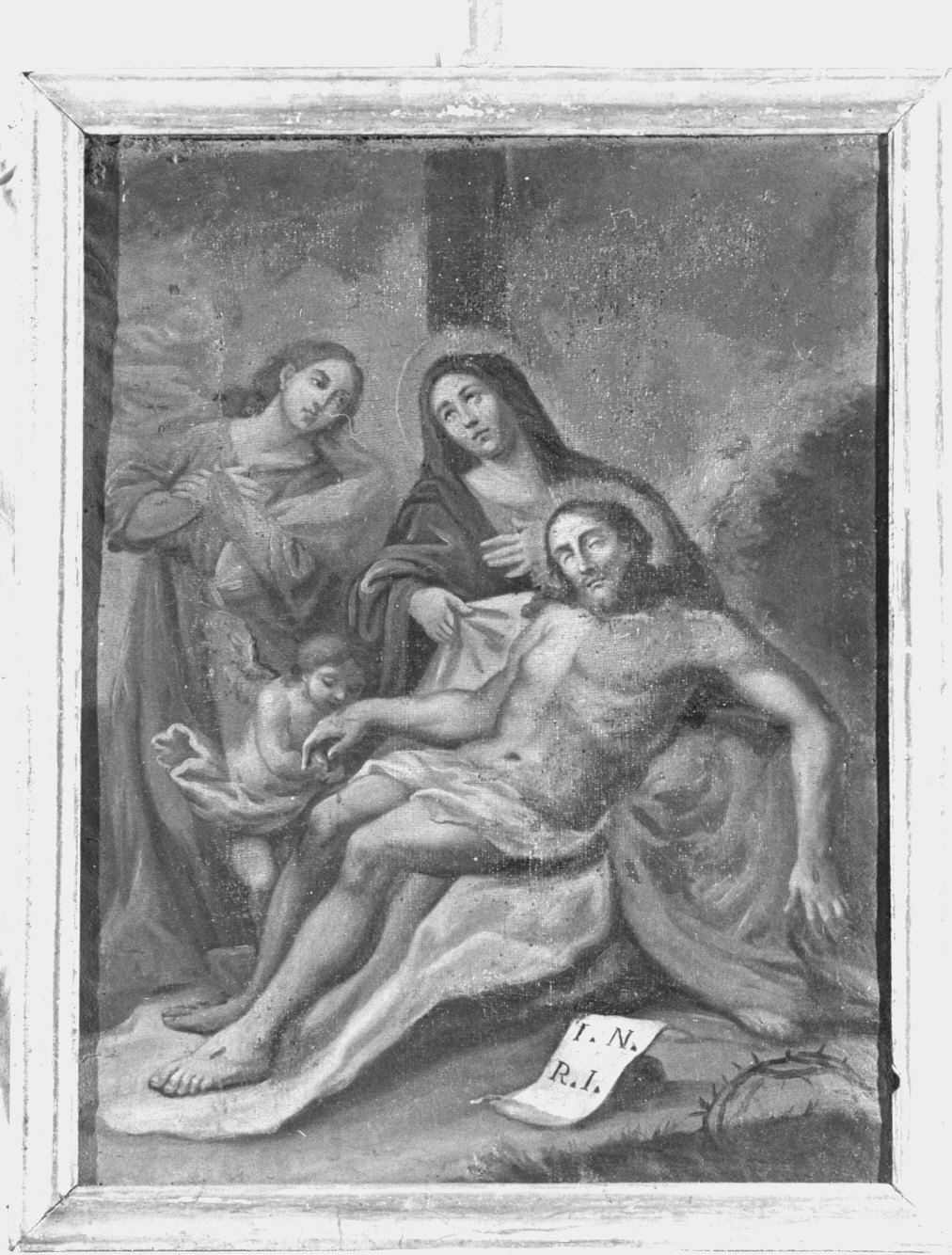 Deposizione. Le 14 stazioni, con cornice in legno e croce in alto, rappresentano le altrettante scene consuete della via Crucis. Nella prima, raffigurante Gesù incororato e legato, condannato a morte nel pretorio di Pilato, c'è in basso il nome degli offerenti e l'anno. Le scene sono pefettamente aderenti al tema: caricato della, prima caduta, incontro con Maria, aiutanto dal Cireneo, asciugato dalla Veronica, seconda caduta ecc