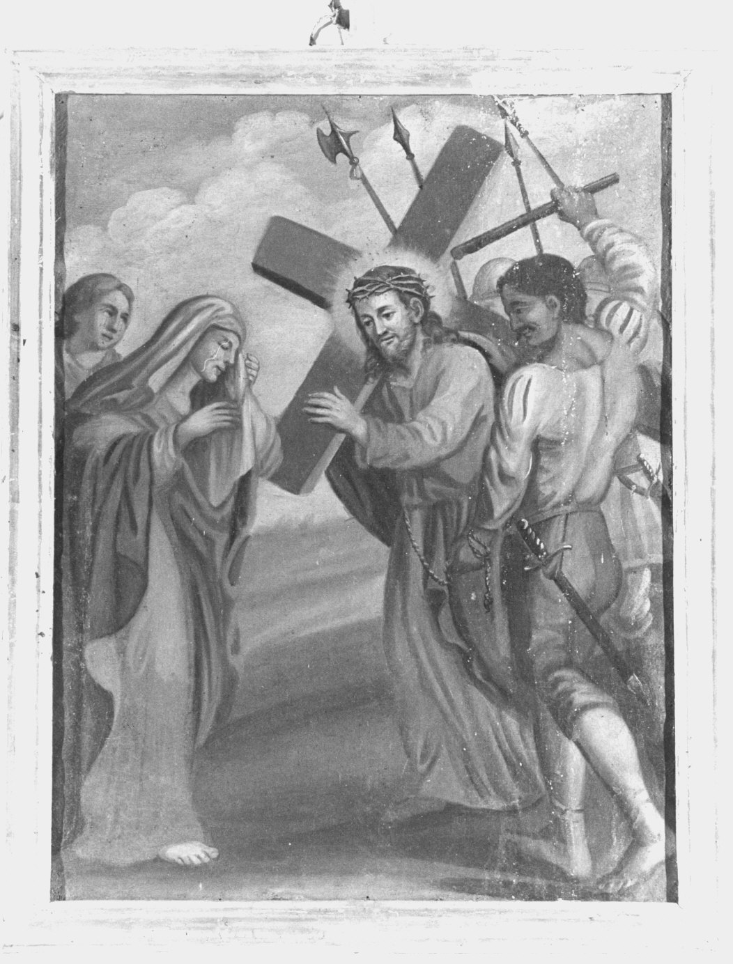Gesù incontra la Madonna. Le 14 stazioni, con cornice in legno e croce in alto, rappresentano le altrettante scene consuete della via Crucis. Nella prima, raffigurante Gesù incororato e legato, condannato a morte nel pretorio di Pilato, c'è in basso il nome degli offerenti e l'anno. Le scene sono pefettamente aderenti al tema: caricato della, prima caduta, incontro con Maria, aiutanto dal Cireneo, asciugato dalla Veronica, seconda caduta ecc