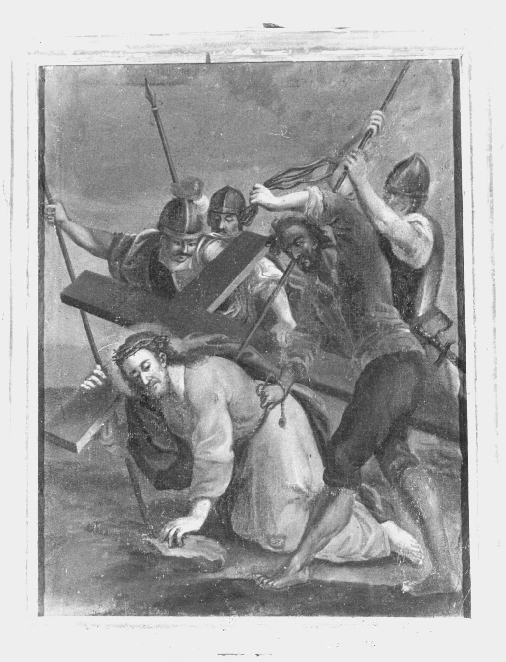 Gesù cade sotto la croce la terza volta. Le 14 stazioni, con cornice in legno e croce in alto, rappresentano le altrettante scene consuete della via Crucis. Nella prima, raffigurante Gesù incororato e legato, condannato a morte nel pretorio di Pilato, c'è in basso il nome degli offerenti e l'anno. Le scene sono pefettamente aderenti al tema: caricato della, prima caduta, incontro con Maria, aiutanto dal Cireneo, asciugato dalla Veronica, seconda caduta ecc